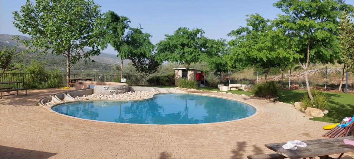 לצד הבריכות דשא מלאכותי ומתחם מוצל עם שולחנות.