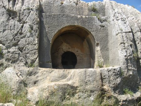 בחזיתו חצובים שני עמודים מעוצבים, תבליט של פרחים ואף ספסל חצוב באבן.